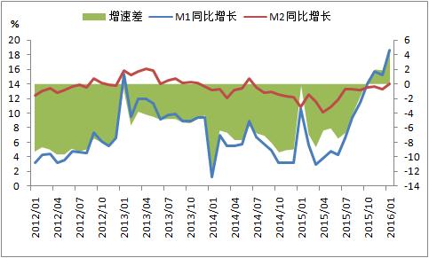 2016年1月末,M1和M2分別同比增長18.6%、14%,增速較上月同期提高3.4和0.7個百分點。其中,M2增速攀升,主要是信貸投放帶動派生存款大幅增加。M1增速攀升,主要是1月份央行通過開展逆回購、MLF、SLF等多元化貨幣政策工具向市場凈投放逾萬億元基礎貨幣。