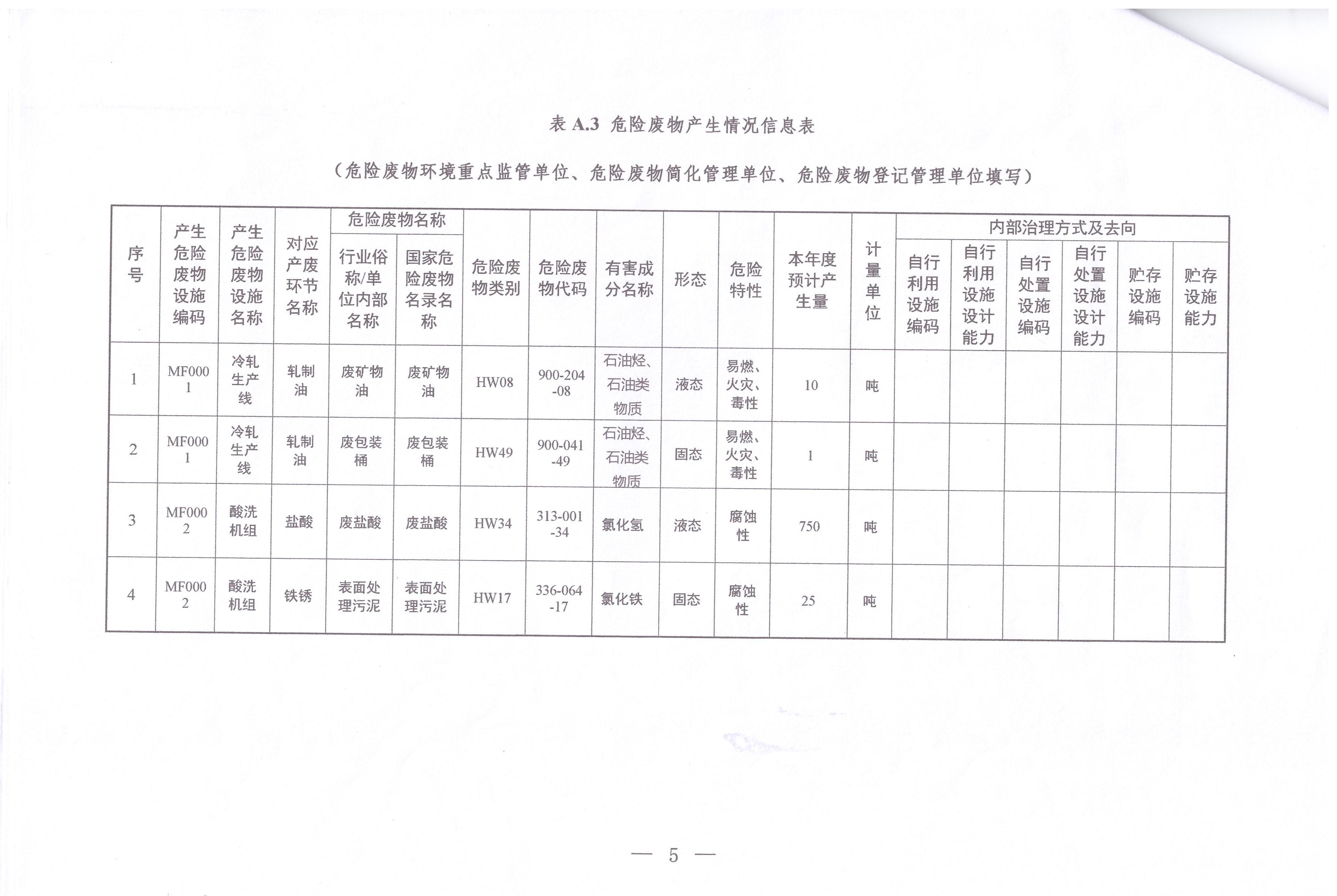 惠州市南鋼金屬壓延有限公司危險廢物產生情況信息表(2024)